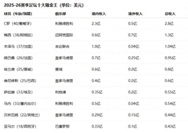 《福布斯》杂志公布2025-26赛季预计全球收入最高的10名足球运动员,C罗以2.8亿美元年收入笑傲榜首,葡国超巨不仅是足坛吸金王,也是体坛收入冠军,篮球名将库里(1.5亿)、英国拳王泰森·富里(1.46亿)、橄榄球巨星达克·普雷斯科特(1.37亿)均向其财富累积能力俯首,梅西1.35亿排名足坛第二,亚马尔榜上有名,回归桑托斯的内马尔则跌出榜单。